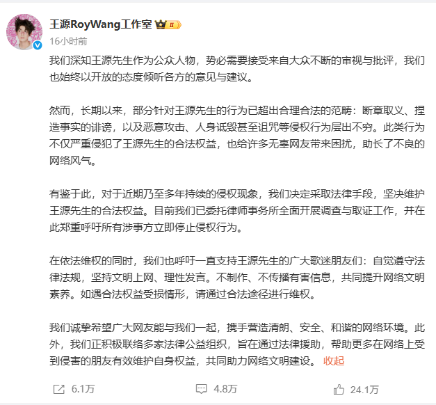 9月26日,@王源RoyWang工作室发文维权,称决定采取法律手段,目前已委托律师事务所全面开展调查与取证工作驰盈优配,在此郑重呼吁所有涉事方立即停止侵权行为。此外,工作室呼吁文明上网,并宣布开展法律援助公益。